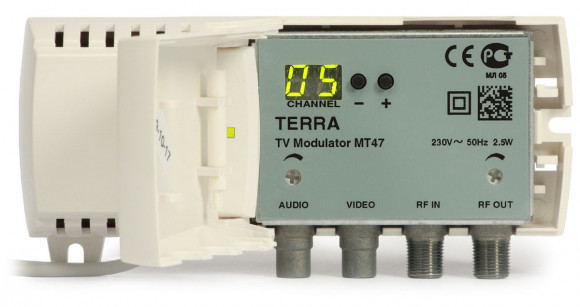 Телевизионный модулятор Terra MT47 используется для преобразования сигнала из низкой частоты в высокую как в дециметровом диапазоне, так и в метровом (с 1 по 69 канал). ТВ модулятор MT 47 широко применяется в спутниковом ТВ с ресиверами, у которых отсутствует ВЧ выход, для подключения нескольких телевизоров (зависимый просмотр).